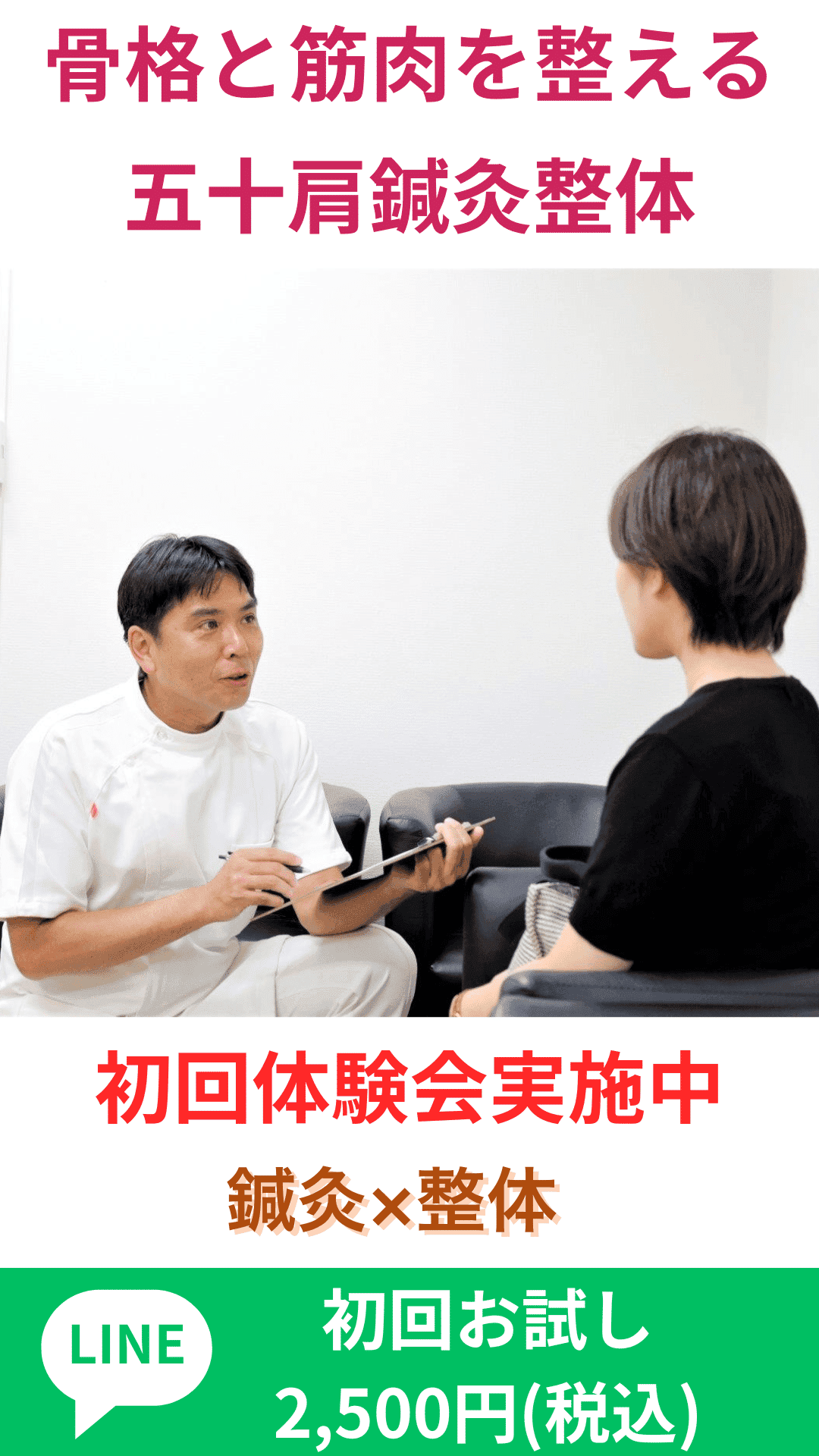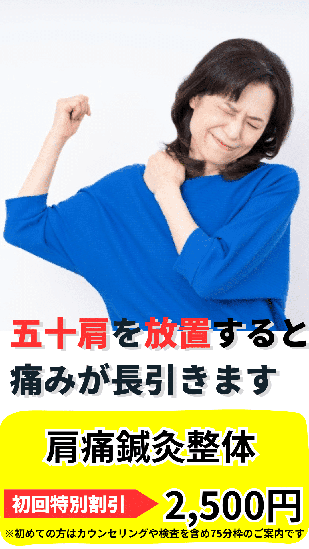 五十肩を放置しておくと回復に時間がかかります。早めに対応した方が関節に滞った炎症を抑え、機能回復につながります。お試し治療も実施しています。初めての方はぜひご利用下さい。